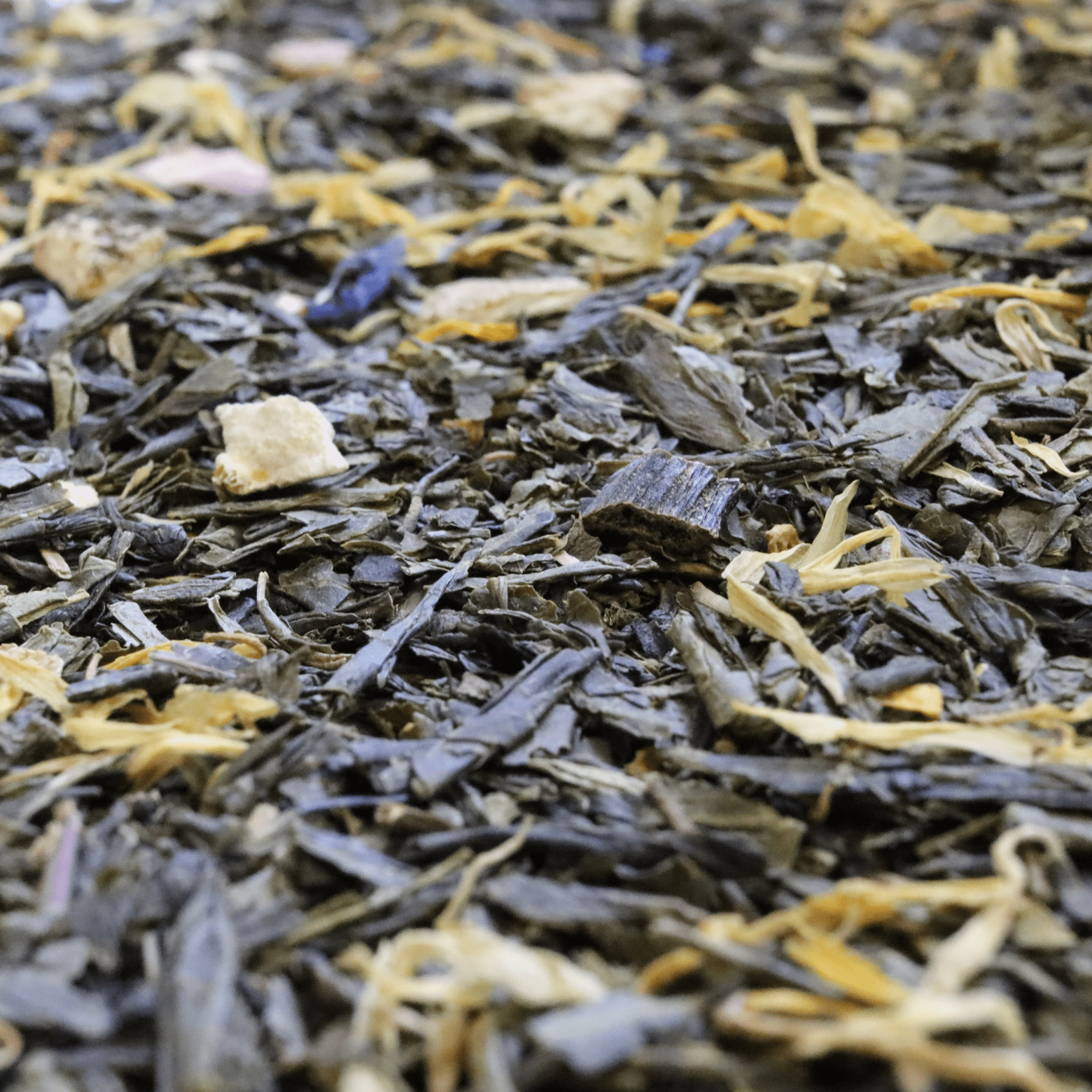 - Ingrédients : Thé vert Sencha, écorces d’orange, pétales de calendula, pétales de rose, bleuet, vanille, arômes naturels