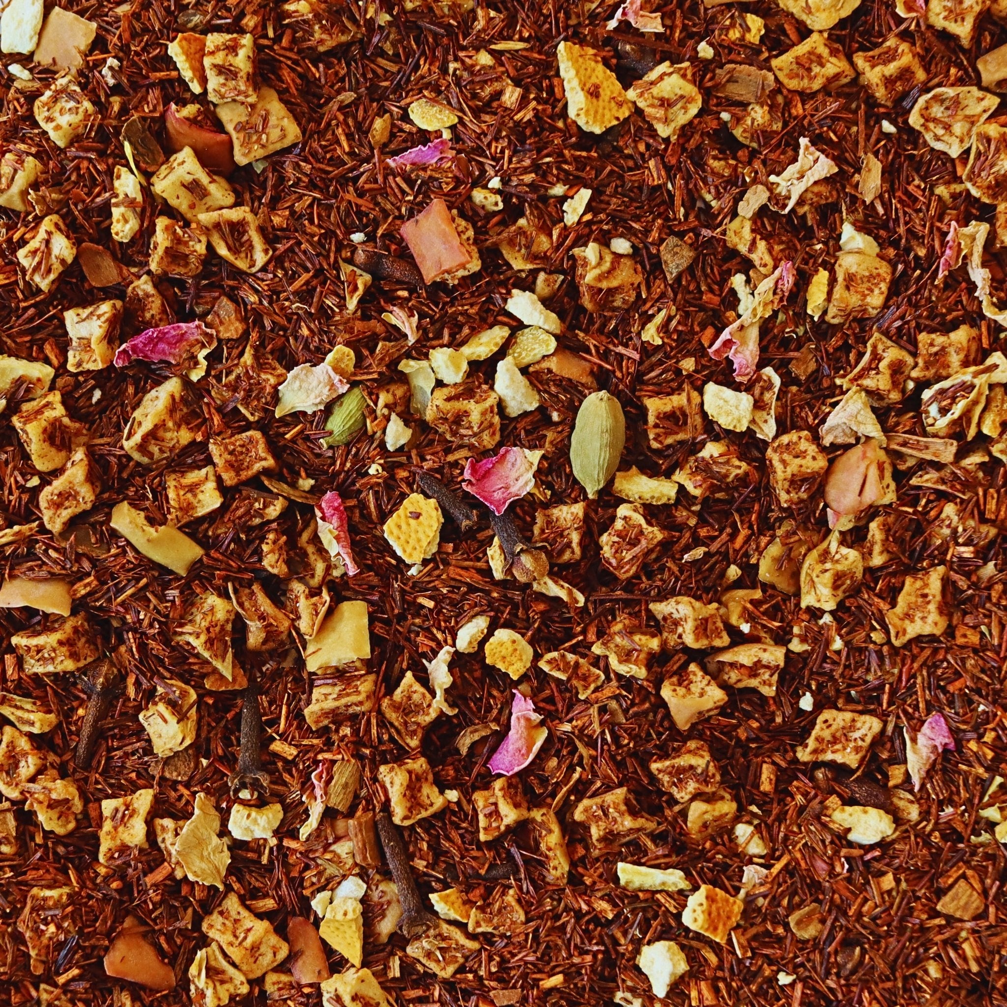- Ingrédients : Rooibos, pomme, écorces d’orange, arômes naturels, clou de girofle, bâtons de cannelle, pétales de rose, cardamome
